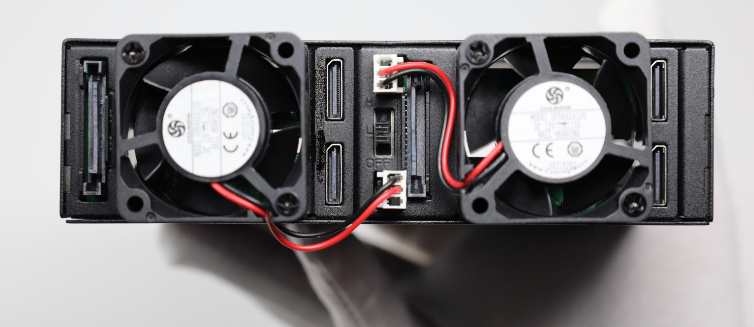 The rear of the MB720MK-B-V2 contains dual SATA power connectors, 4x OCuLink 4-lane connectors, two fans, and a fan speed switch. The speed selector came set to low and was hard to hear in operation and kept my drives nice and cool. As a result, I never felt the need to even use the high settings. The use of OCuLink is again an interesting decision, as while this cable connector provides an ideal physical size it remains a somewhat obscure interconnect that many uses will not be familiar with and motherboards may or may not support depending on the motherboard vendor. Things are certainly much less standardized than in the old SATA/ SAS days.
