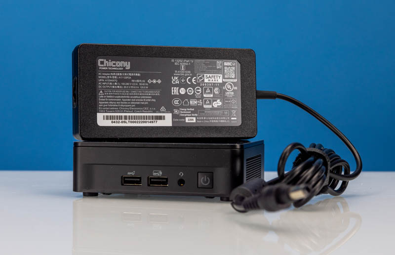 Powering the unit is a 120W external power adapter. Something that is common on NUCs that many may not be aware of is that with all three of our NUCs, the portion that goes from a C5 connector to the wall socket is not supplied. That allows Intel to make one SKU and sell it worldwide, and the C5 to the local socket parts are generally easy to source inexpensively.