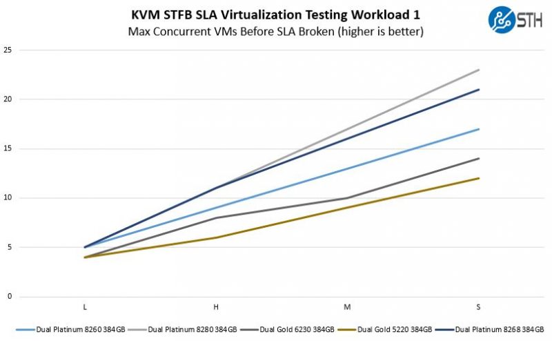One of the other workloads we wanted to share is from one of our DemoEval customers. We have permission to publish the results, but the application itself being tested is closed source. This is a KVM virtualization-based workload where our client is testing how many VMs it can have online at a given time while completing work under the target SLA. Each VM is a self-contained worker.