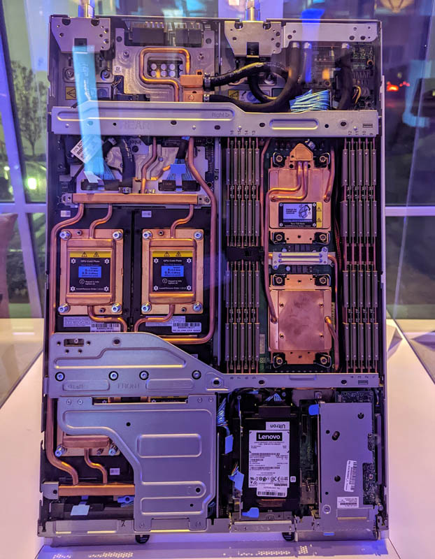 Lenovo had its Florence platform with Neptune liquid cooling on-site. Here is a shot of the Lenovo ThinkSystem SD650 I V3 with four Intel DC GPU Max OAM modules and Sapphire Rapids.