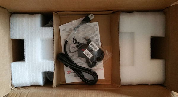 As we open the shipping box the first thing we see is a cardboard tray at the top which houses the power cord, documentation and mouse. We also see the large foam inserts on both sides of the workstation.