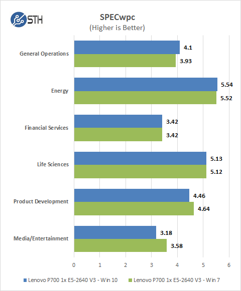SPECwpc results can vary by a large amount depending on the GPU and Storage drives used. Several results can be boosted by using a higher end GPU. The difference between Win 7 and Win 10 are slight here with a hit to performance in Media/Entertainment.