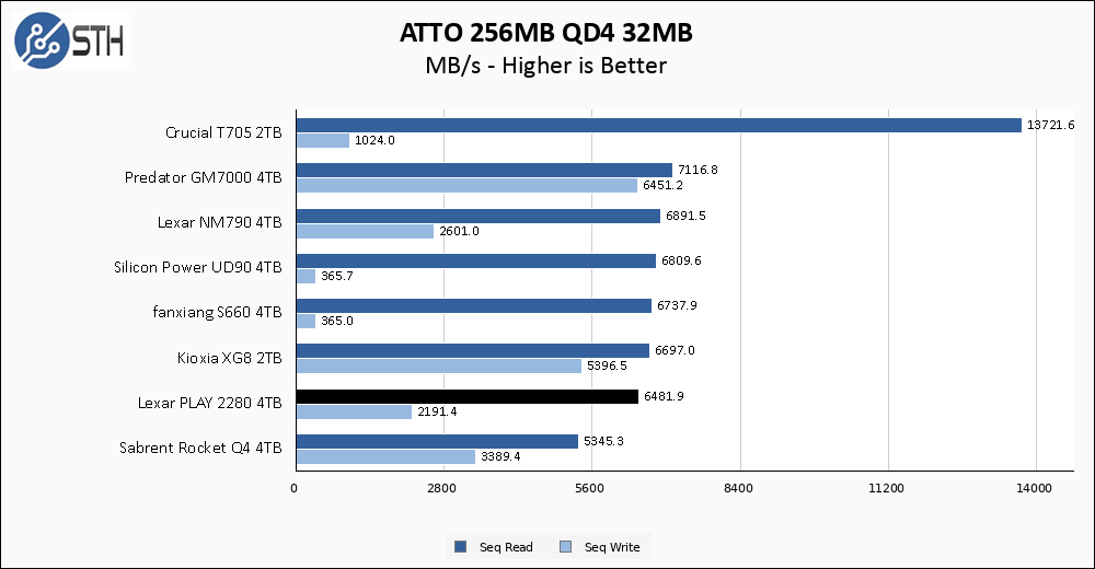 The PLAY 2280 improves slightly on the larger CrystalDiskMark test, and now I would say it is close enough to pass for hitting its rated performance. I do not have a lot of 4TB drives in my overall test set, but the PLAY 2280 is performing well next to everything I have to compare it against.