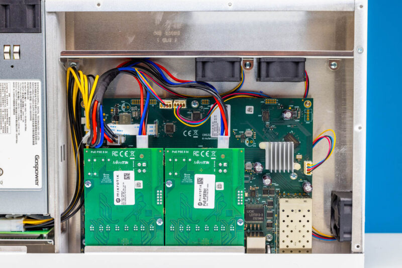 Inside the switch, you can see that the two power supplies dominate the switch, but it is built a bit differently than other switches we have seen from MikroTik.