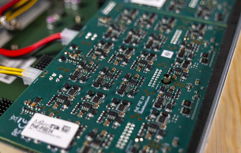 Perhaps one of the biggest changes here is that there are two large PCBs that sit atop the main switch PCB. Each of these PCBs has a 4×6 matrix of components so you can fairly easily make out the power delivery components for each port of the 24 that they service.