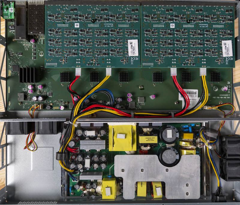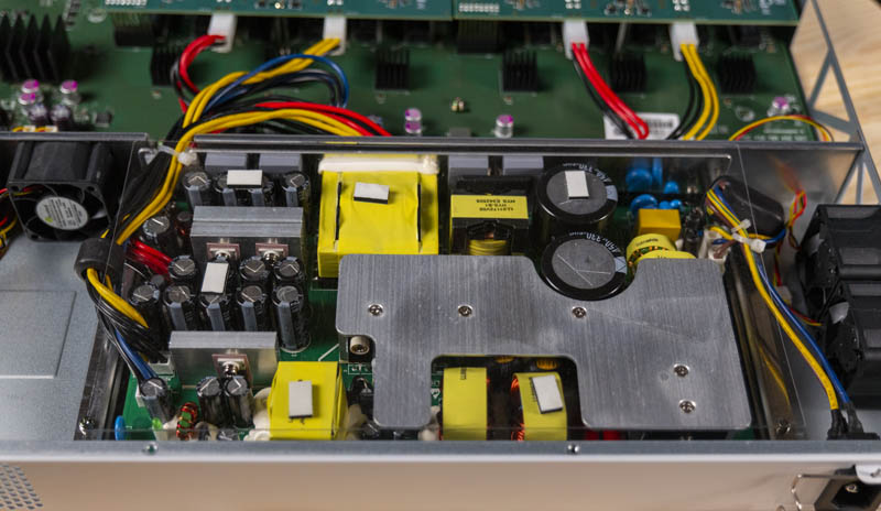 Powering all of this is a much larger 800W power supply. In the non-PoE version, we had two smaller PSUs that only needed to deliver a maximum of around 60W to the switch. In this version, we have a much larger PSU that supplies higher and lower voltage power feeds to those 24-port PoE PCBs.