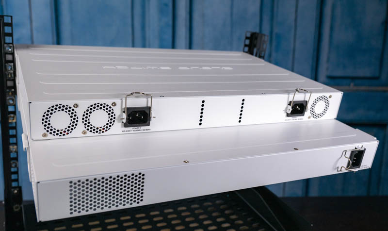 Unlike the 48G non-PoE model and much of the CRS line, this does not have redundant power inputs. Indeed, the model had to get 85mm deeper just to accommodate the single 800W PSU for all of the PoE devices. Here is the 48G model racked atop the 48P model.