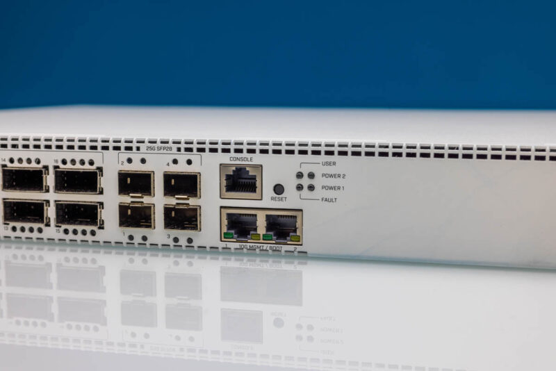 Next to that we get a console port and reset button. There are then two 10Gbase-T ports. These 10Gbase-T ports go directly into the Annapurna Labs management processor not to the Marvell switch chip, so there is an additional hop in the chain to them.