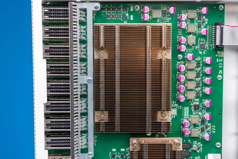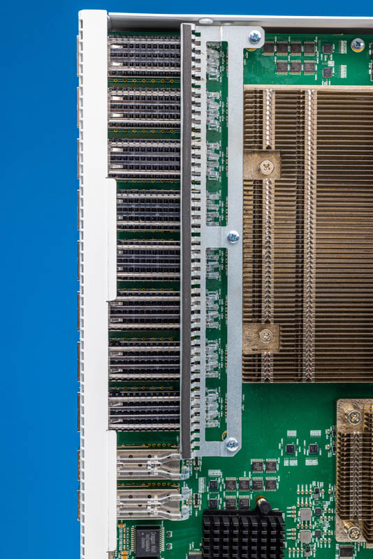 The switch PCB is in the middle of the QSFP28 ports, so there are eight on top and eight on bottom. MikroTik has this bar that goes across over the QSFP28 cage heatsinks. Our best guess on what this is for is to keep the plastic light guides in place for the port LED indicators. We think this is the case because we knocked off a SFP28 port’s LED light guide and those ports are not covered by this bar.