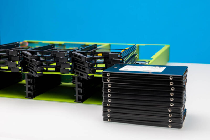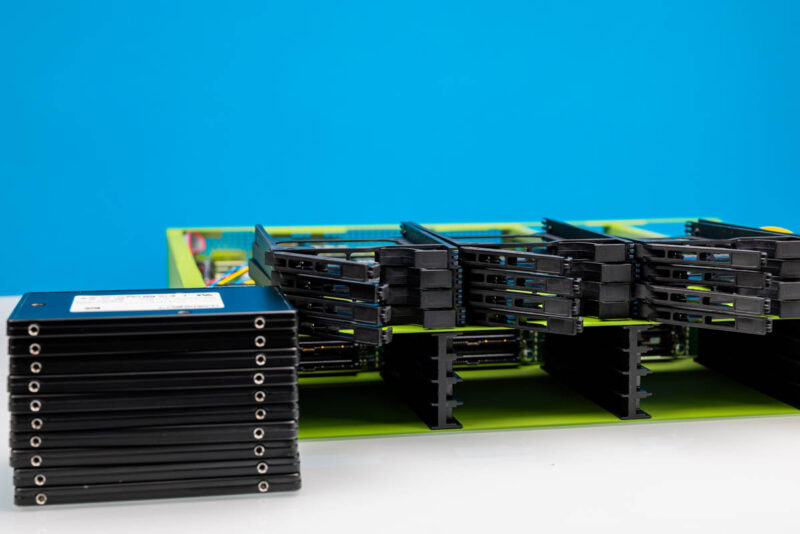 One of the challenges, is that these drive bays are not just NVMe bays but they are 7mm. Finding 7mm U.2 drives is a bit difficult these days as enterprise drives are usually 15mm.  That has two impacts. First, the selection of drives is not great. Second, the capacities are lower. 15mm drives that are 8TB and under can be purchased second hand relatively inexpensively, and the 15mm form factor already scales to $30K+ (new) drives that are 122.88TB. You just get more options in the 15mm sizes. The third challenge is that this means we only get PCIe Gen3 x2 to each drive, and not even a full x2 to all of the drives at that since they are switched. The first thing we would change with this is to switch to fewer 15mm drive bays.
