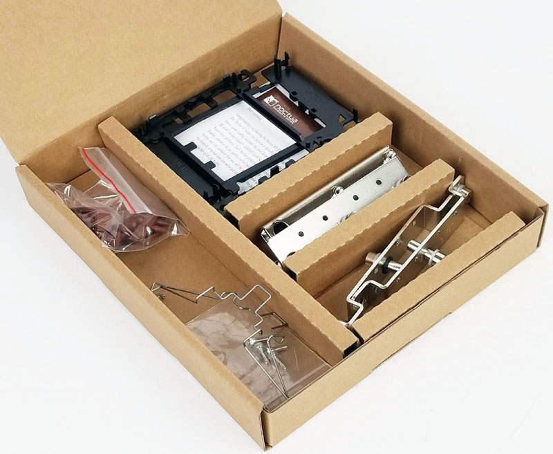We see mounting brackets, CPU carriers, instructions, and extra Anti-vibration pads and clips for a second (optional) NF-A15 cooling fan. The Noctua NH-U14S DX-3647 includes mounting brackets and CPU frames for both Narrow and Square socket LGA3647 setups. You can read more about the differences in: Narrow ILM v Square ILM Socket LGA 3647 Heatsink Differences.