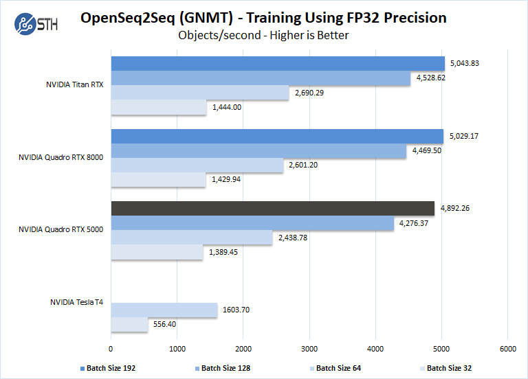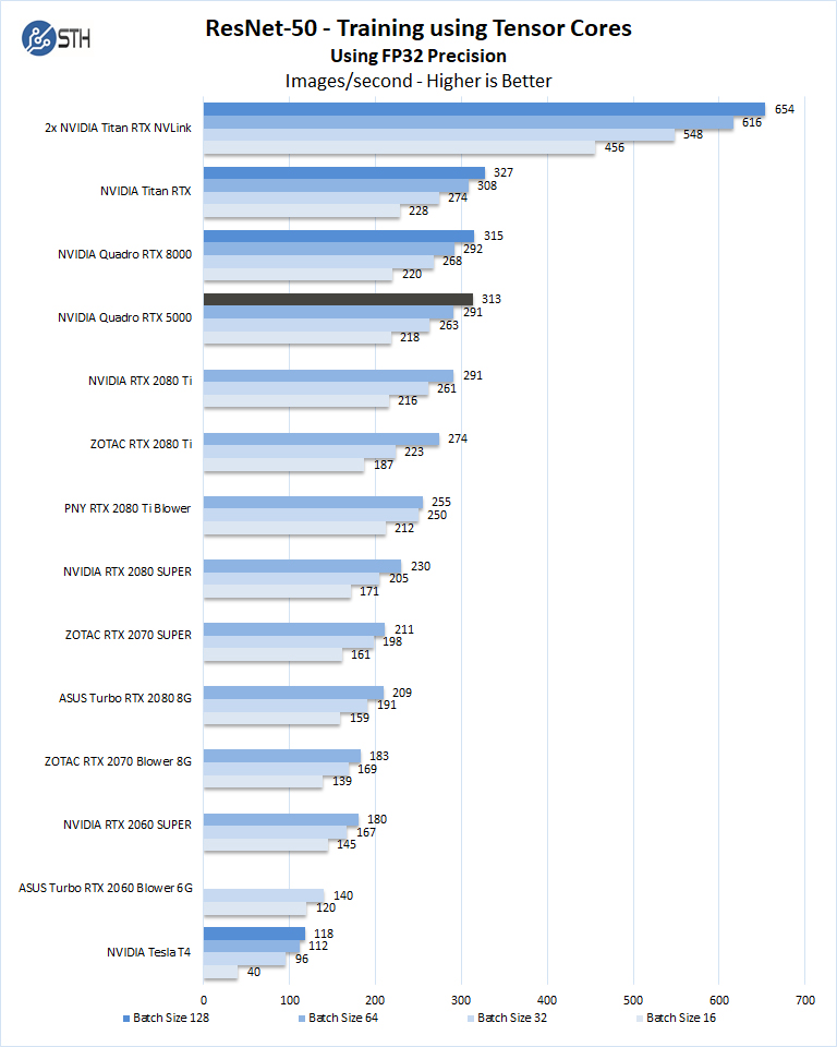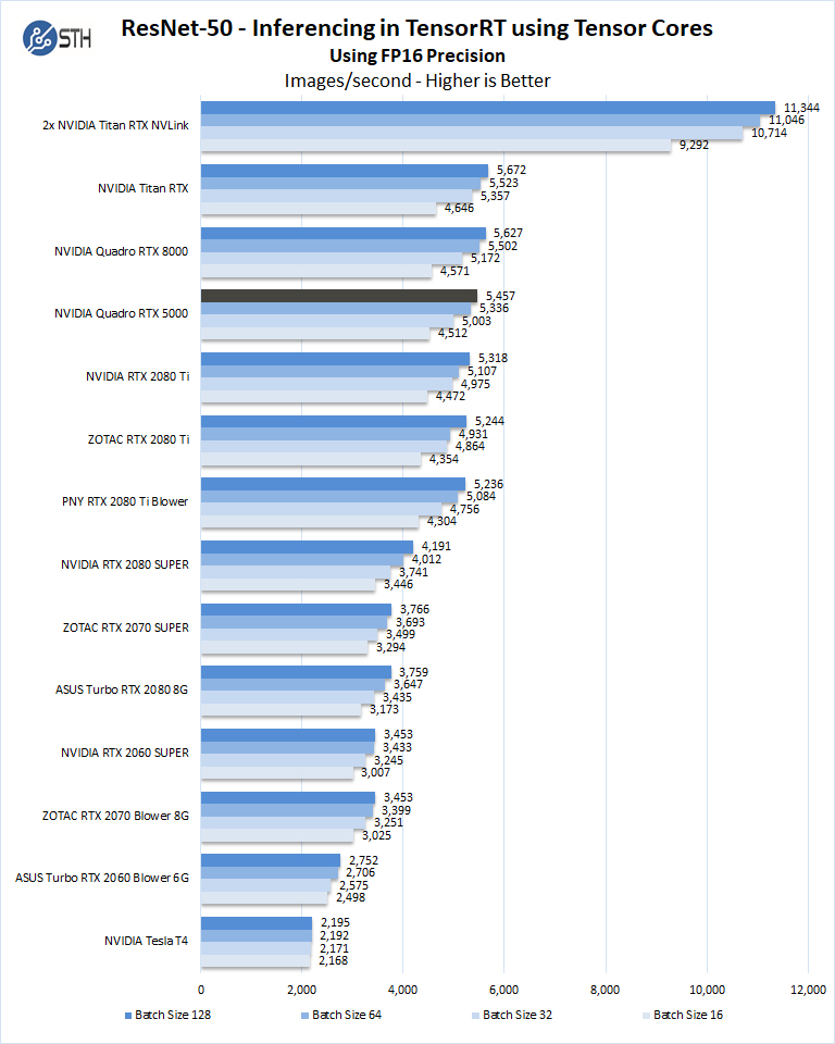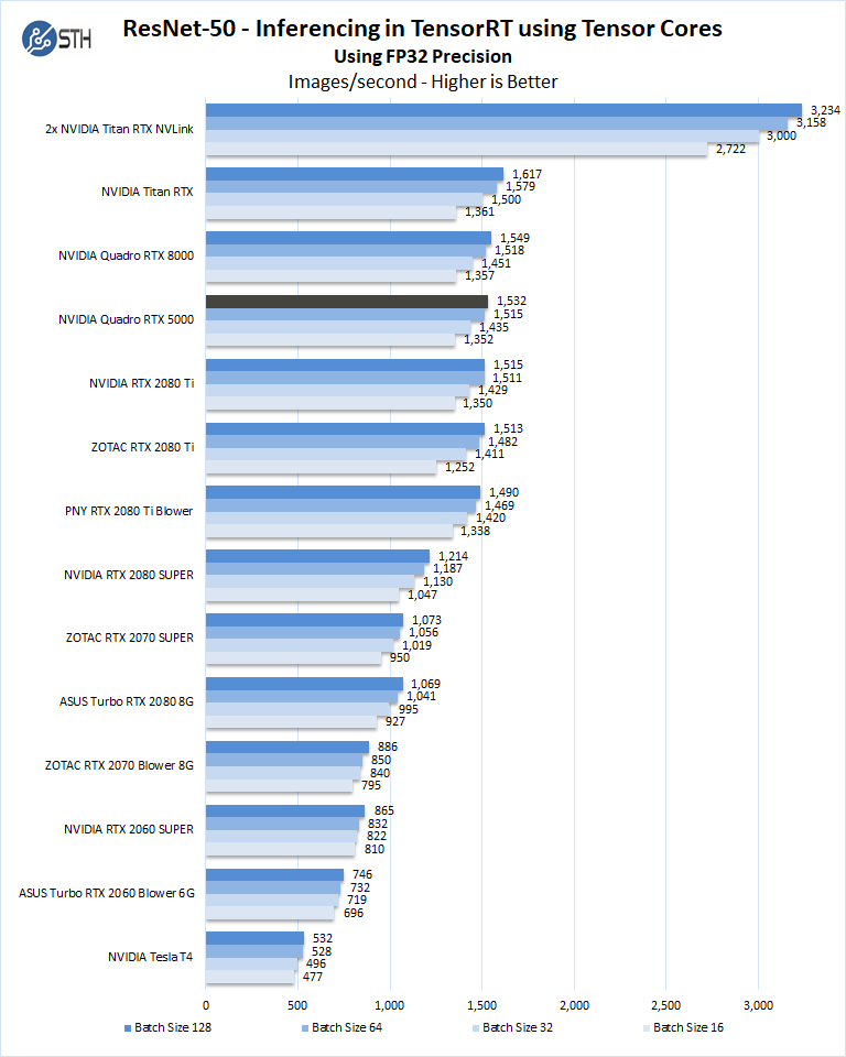 Here we can directly see the impact of having 16GB of memory. We are able to scale to a batch size of 128 on this test. The large batch size yields more performance and so we are seeing great results from the Quadro RTX 5000.