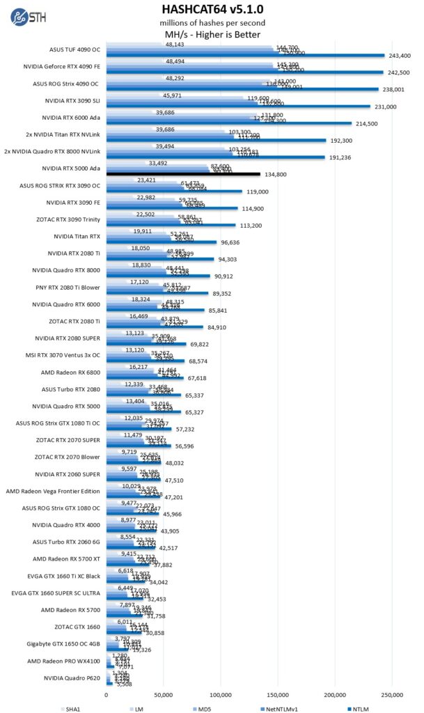 hashcat64 is a password-cracking benchmark that can run many different algorithms. We used the Windows version and a simple command of hashcat64 -b. Out of these results, we used five results in the graph.