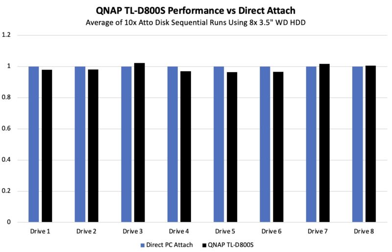 That is what we saw with this unit. All eight drives seemed to have straight-through connectivity. There are some variances on the chart, but within a 5% margin for benchmarking, so it is not like a drive is running at SATA II 3Gbps instead of SATA III 6Gbps speeds.