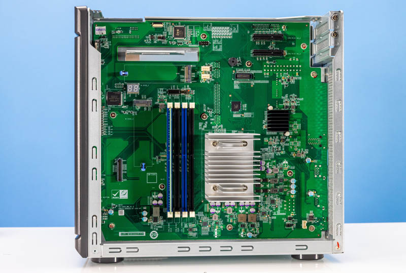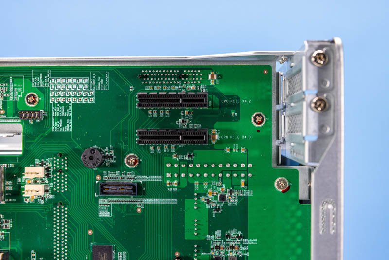 There is a third slot on the back side of the motherboard along with the ATX power input. Having three PCIe slots means one can add 2.5GbE, 10GbE, 25GbE NICs, NVMe storage, and more. QNAP has a number of offerings with fans on the cards to be able to work in this system.