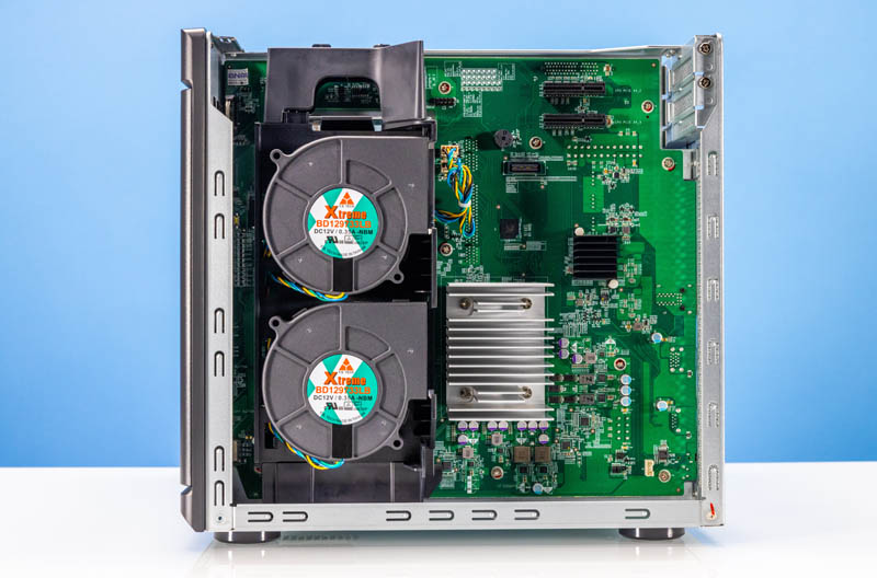 By removing the airflow partition for this section of the NAS, we can see the internals more clearly. Under the large heatsink, we get an Intel Atom C5125 processor. This is one of the new Intel Atom C5000 Series processors. The Intel Atom C5125 is an 8-core CPU that is part of Intel’s newer generation of storage Atom SoCs. With the storage focus, it has more PCIe Gen3 lanes and root ports but loses the Intel Ethernet E800 series IP found in some of the other Atom C5000/ P5000 parts. It also gets up to 20Gbps QAT Gen2 look-aside crypto/compression offload, but that is a feature we could not find QNAP enabling in hardware. This is a very modern SoC.