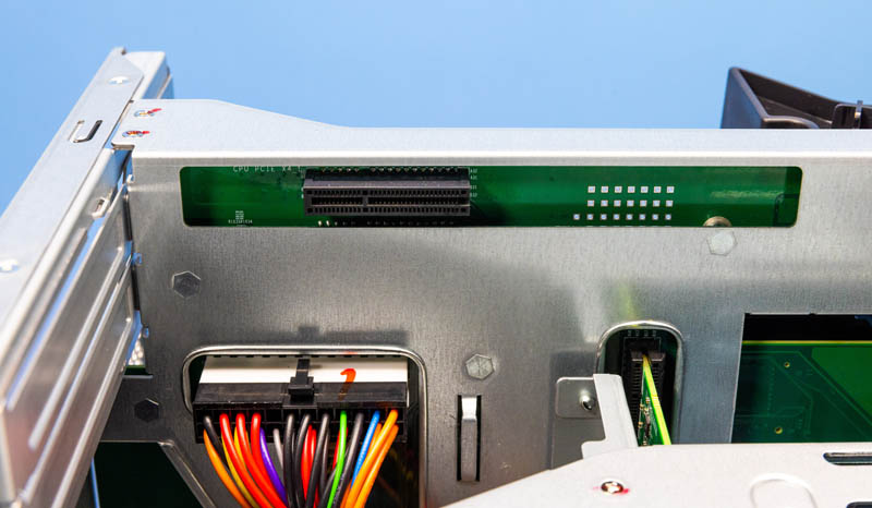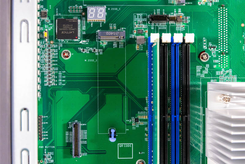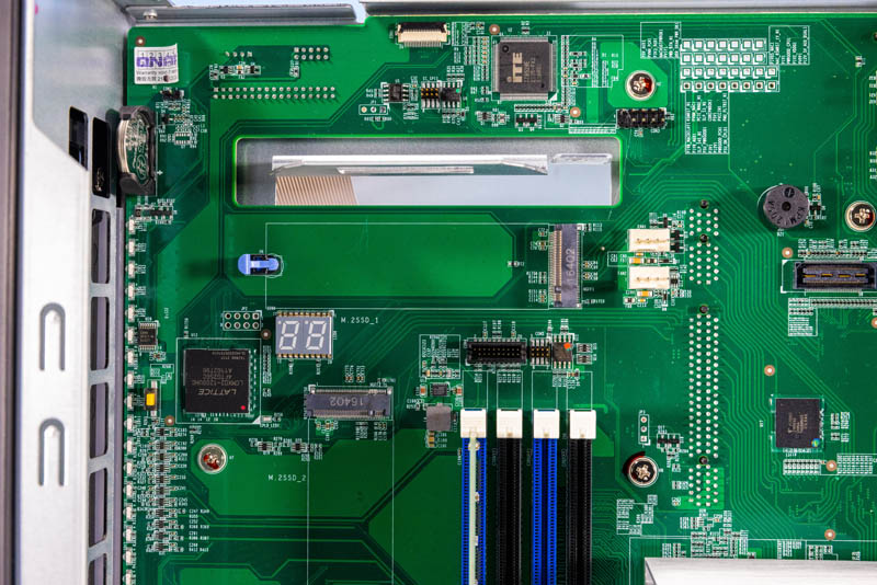Above the DIMMs, we get the mounting point for the airflow partition and underneath a M.2 slot. Although there are 16x SATA bays (12x 3.5″ and 4x 2.5″) there are a number of avenues to add M.2 storage as well.