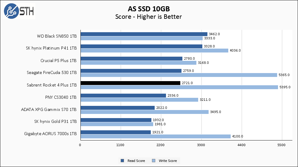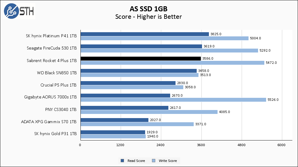 Performance in the larger AS SSD test once again mirrors the FireCuda 530, with the Rocket 4 Plus slightly behind in read score and slightly ahead in write. Write score is easily top of the chart, though read score comes in behind several other models.
