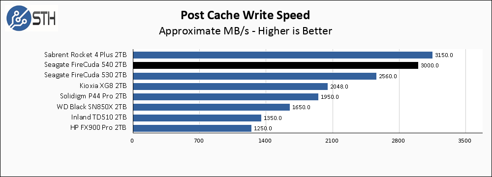 With that said, in terms of sustained write performance there is a massive gulf between the FireCuda 540 and the Inland TD510. Coming in at 3 GB/s+ versus the sub 2 GB/s result of the TD510, the Seagate drive here hammers in a solid victory.