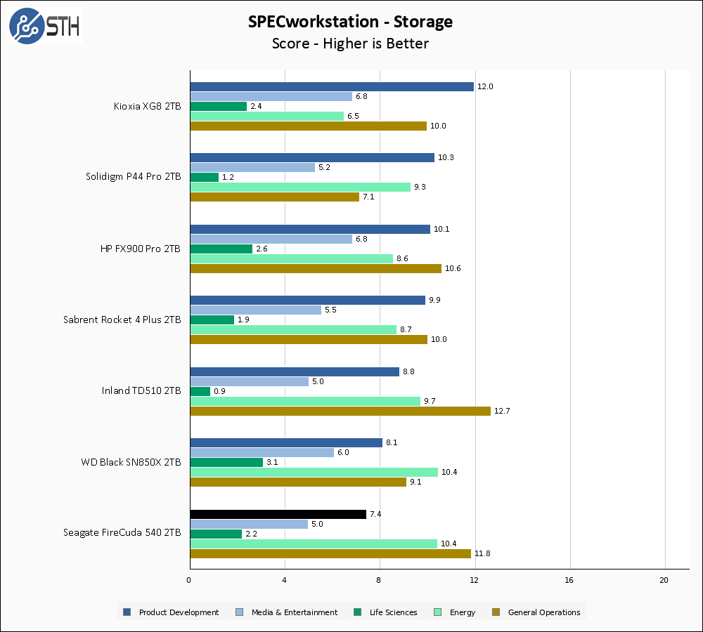SPECworkstation is certainly a mixed result. We always sort this graph by Product Development, which plops the FireCuda 540 right at the bottom of the chart. With that said, if we sorted by the Energy test the entire chart would flip. In another similarity with the TD510, the results here do not stand out much versus the PCIe Gen4 crowd of drives.