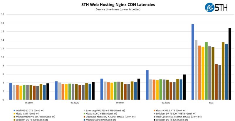 Moving to the file server and nginx CDN, we see better QoS and throughput from the Solidigm D5-P5336, especially versus other SSDs. On the nginx CDN test, we are using an old snapshot and access patterns from the STH website, with caching disabled, to show what the performance looks like in that case. Here is a quick look at the distribution: