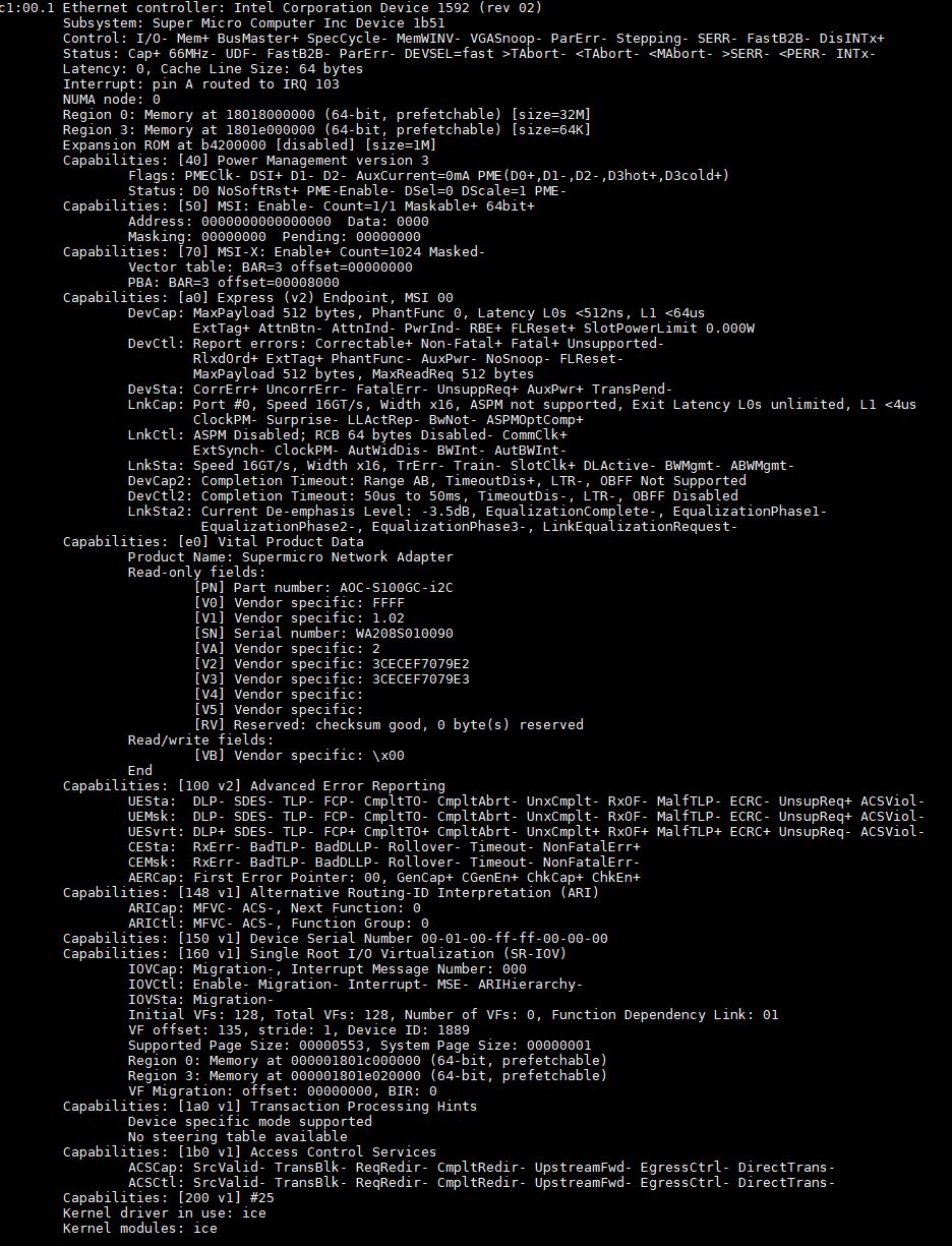 The new Intel Ethernet 800 series is a 100GbE adapter. 100 in Roman numerals is “C” so we get the ice driver (Intel 100 Ethernet.) Also here is the lspci output using the Intel ice driver: