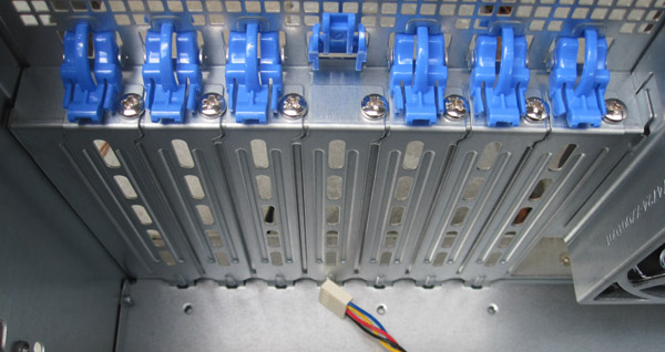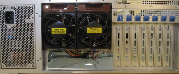 One will notice that the power supply fan pulls air from the front of the chassis exhausting in the rear. The front removable fan mentioned earlier pushes air through all of the expansion slots due to the ducting. This setup worked well as even being stressed, none of the expansion cards overheated during testing. Dual mid-line 80mm x 38mm PWM controlled fans exhaust air from the part of motherboards usually occupied by RAM and either one or two CPUs.