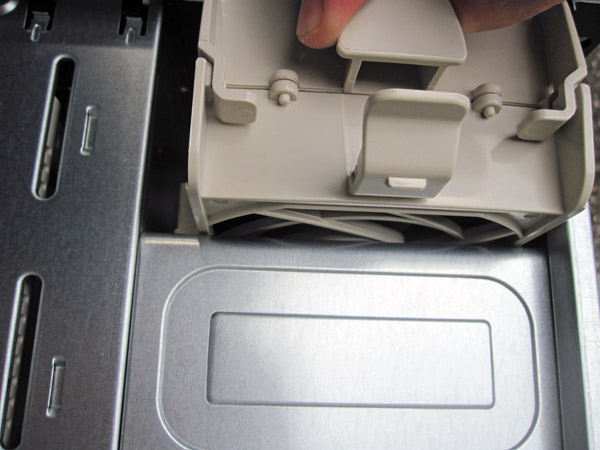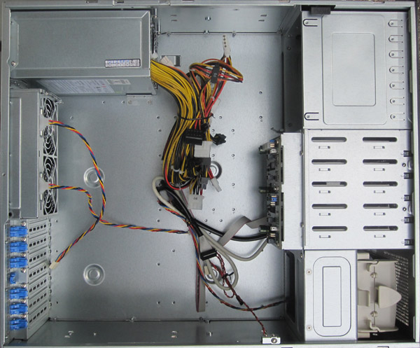 Also pictured above are the three 5.25″ bays which can be used for optical drives and/ or mobile racks on the left side of the picture. The bottom left shows the slim CD/DVD carrier among the power supply cables. On the right side of the above picture one can see the hot swap 92mm fan that has a duct redirecting half of the airflow to the center of the chassis. This helps more evenly distribute air to the center of the chassis since there is no room in such a short chassis for a mid-chassis fan partition.