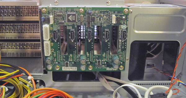 The 3.5″ hot swap bays support SGPIO (two ports) which allows one to see which drive failed via the LEDs associated with each 3.5″ slot. On the flip side, the backplane accepts two 4-pin Molex style connectors and five standard 7-pin SAS/ SATA connectors. Since the Supermicro X8DTH-6F supports SGPIO this was easy to connect.