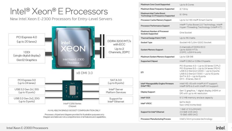 Since this is the first server we are reviewing with the new Intel Xeon E-2300 series, here is the slide showing what the platform offers, and where some of the basic features reside between the CPU and PCH.