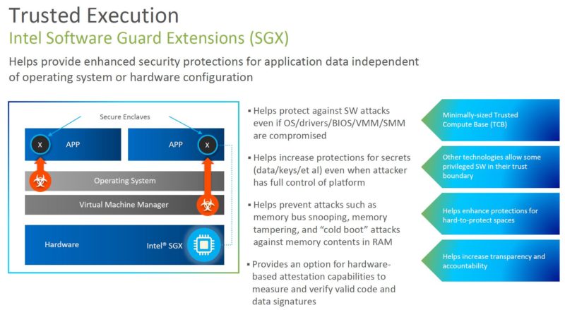 Intel SGX is a secure enclave solution to enhance security for VMs. There are a number of industries and applications where confidential computing is becoming an important feature. These confidential computing platforms really started being deployed around 2020 so the feature is still relatively new. One of the big areas that SGX helps with is to ensure that the cloud provider cannot see into the virtual machines running on the host. This is becoming a popular technology in servers and server processors.