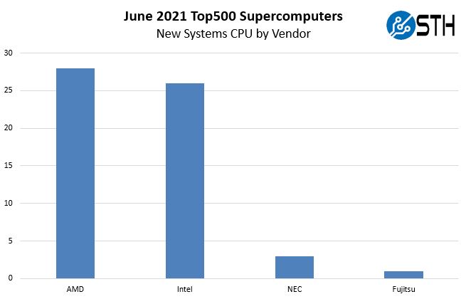 In November 2020 when we excluded pre-2018 x86 “new” systems Intel was in almost twice the number of new systems as AMD. Now, even without removing those older Skylake CPUs, AMD is slightly ahead. Although the number of systems may look similar between Intel and AMD, it is fairly clear that AMD is sold more cores into the June 2021 Top500 list’s new systems. Here is the AMD v. Intel mix: