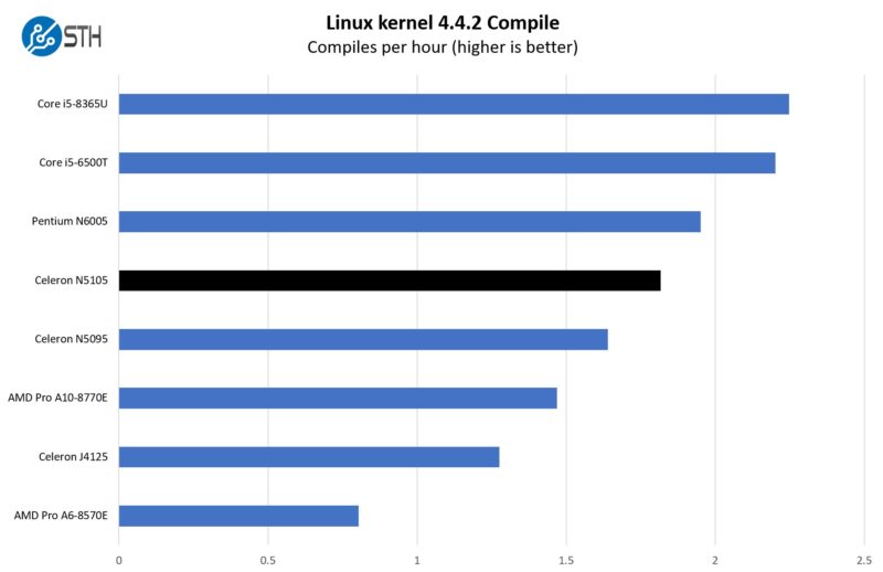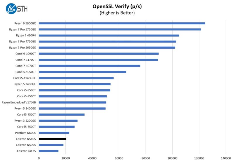 Here we can see a few major items. First, this Atom N5105 is not quite at the level of the Core i5-8365U we saw in the Lenovo m90n or the Core i5-6500T. It is also faster than we got with the first Project TinyMiniMicro HP EliteDesk 705 G3 Mini CE Review and their 35W AMD Pro chips. Compared to the Celeron J4125.
