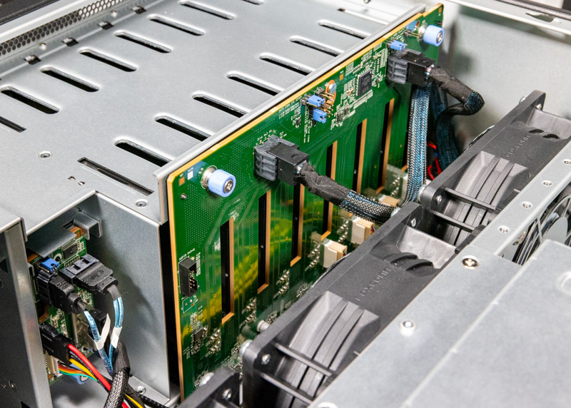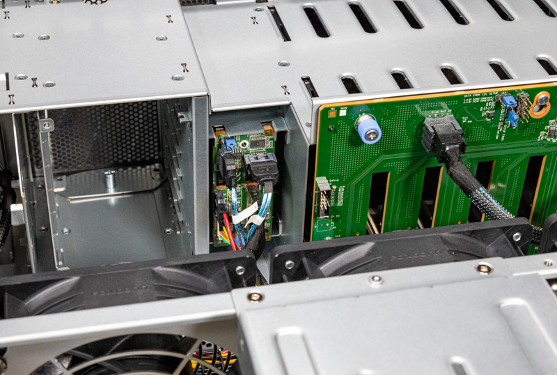 Another big front facing feature is the dual 2.5″ SATA/SAS/NVMe bay. Here we have two 7-pin SATA connectors and then also a higher-density PCIe connection to provide capability for NVMe SSDs. Our sense is that most will use these slots for SSDs.