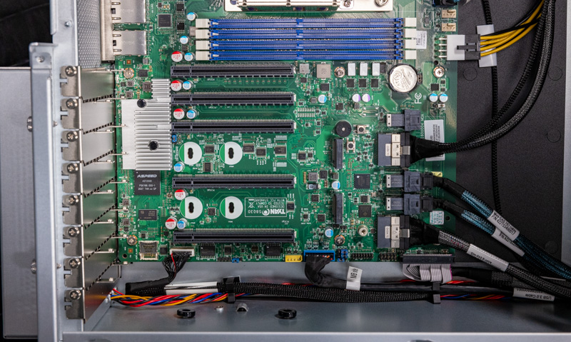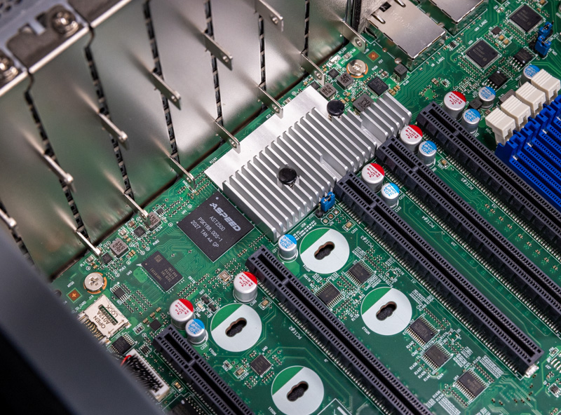 Tyan is still making use of space elsewhere. There are two M.2 SSD mounting points between these double-width PCIe slots. The other two x16 slots are single width but one could put a double-width accelerator on the top slot thereby blocking the bottom. There is certainly a lot of flexibility with this design.