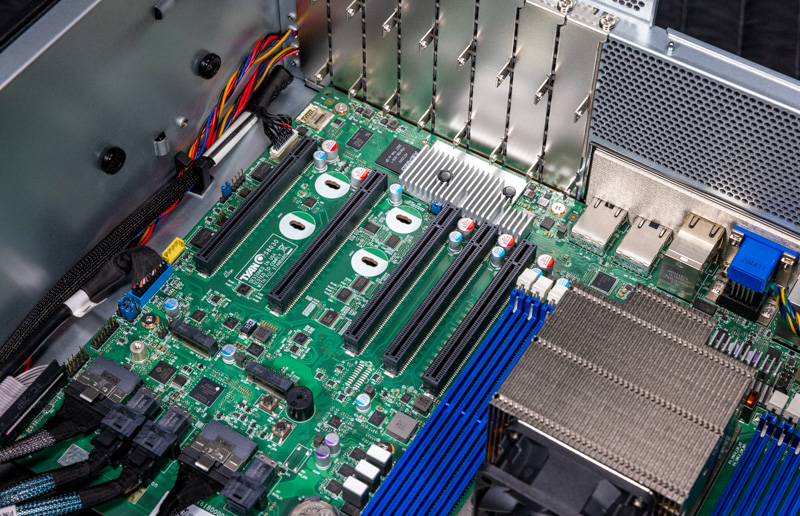 In terms of primary PCIe slots, there are five PCIe Gen4 x16 slots. Three of these slots are double-width with the bottom PCIe slot having a second I/O slot in the chassis for dual-slot GPUs and accelerators.