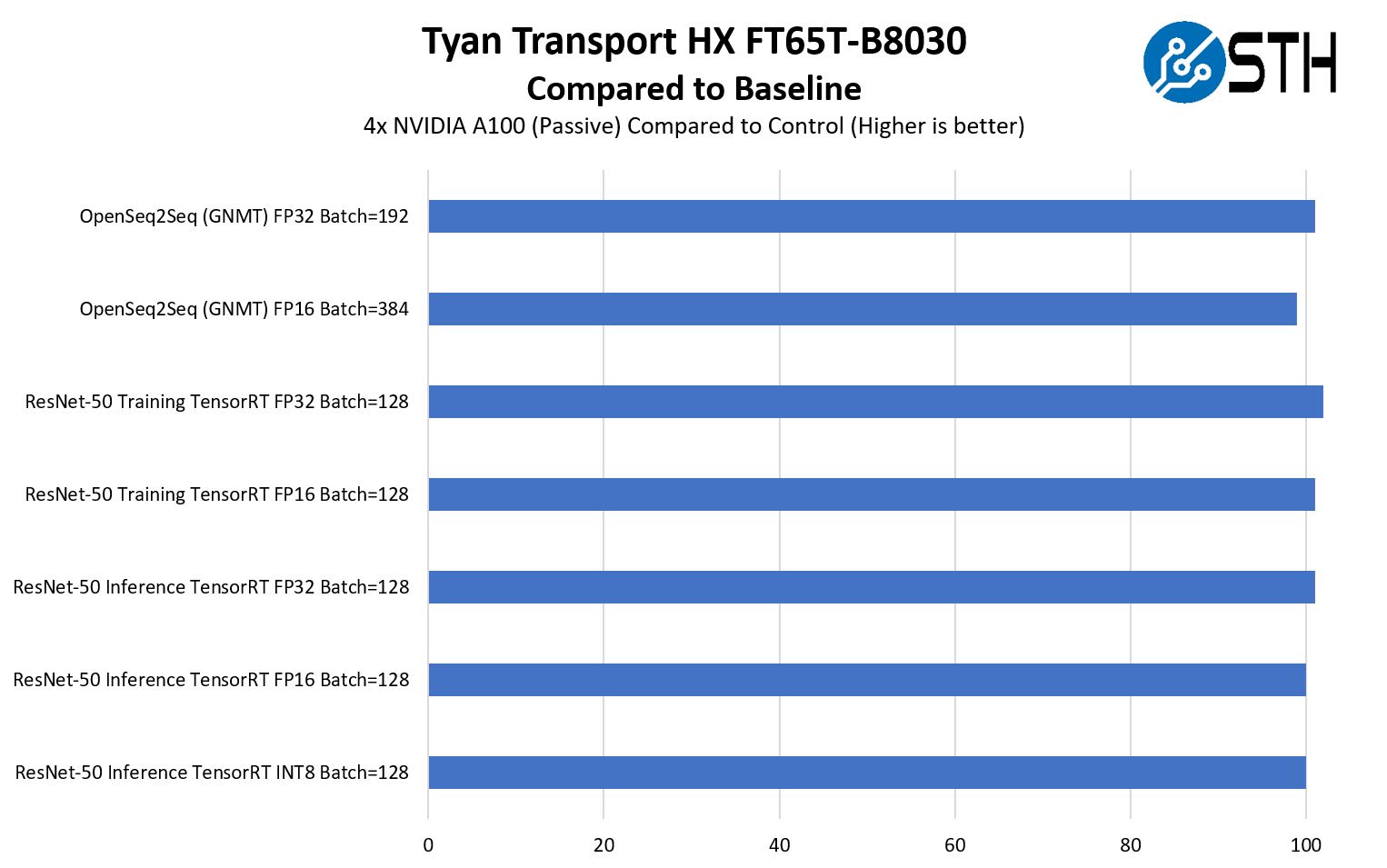 In general, we actually saw a better performance, due to very slightly lower temps than in the 2U GPU servers we have tested. We have seen 1U servers perform slightly worse and this 4U platform performs better with these same four NVIDIA A100 GPUs.