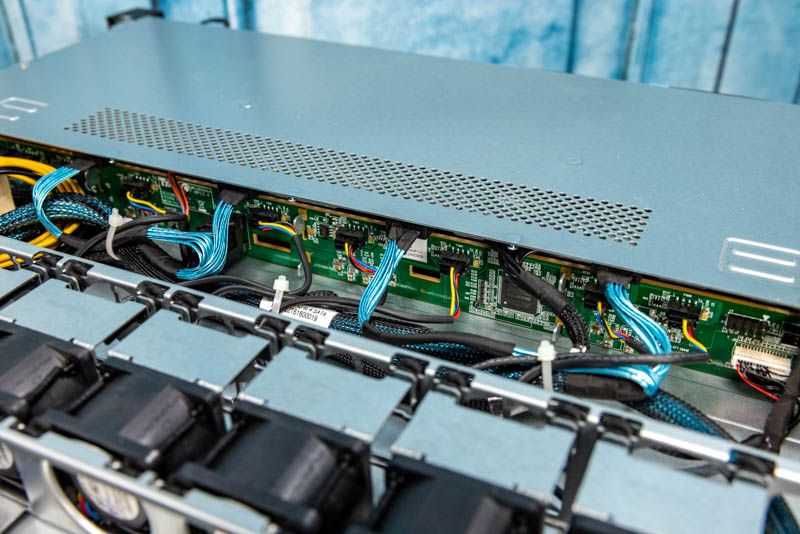 One interesting point is that the fans are not counter-rotating units. Instead, we have an array of single fans. These fans have little carriers which is an interesting design itself. The fans are not easily hot-swappable like we see standard on 2U servers. It is more common on 1U servers though to have standard fan headers. In this case, the fan headers are on the storage backplane, not the motherboard.