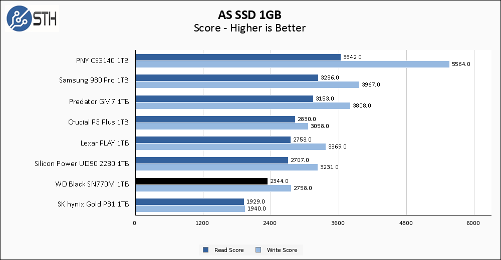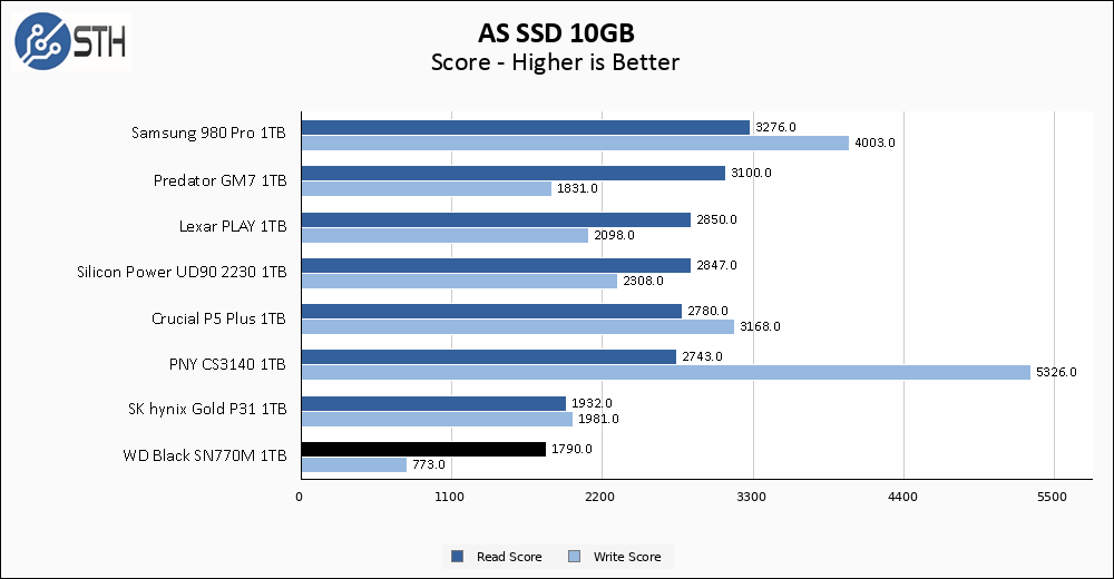 Things get even worse for the WD Black SN770M on the larger AS SSD test. Performance now drops below even the only Gen 3 drive on my chart, for both read and write score. In particular, the highly threaded 4K random read and write performance took a hit, and in writes that hit was particularly large.