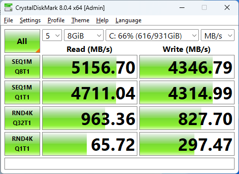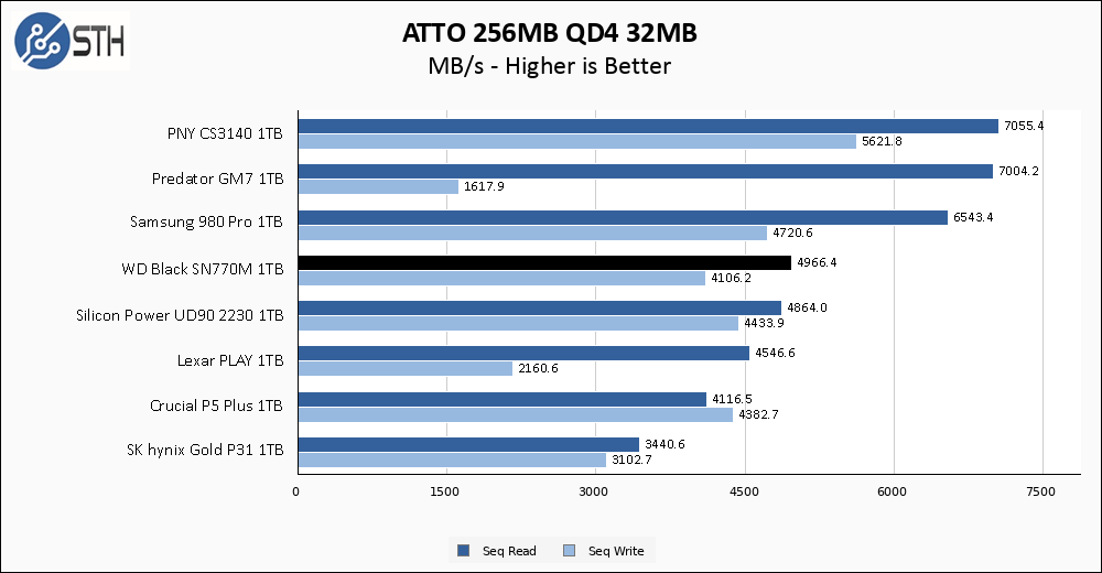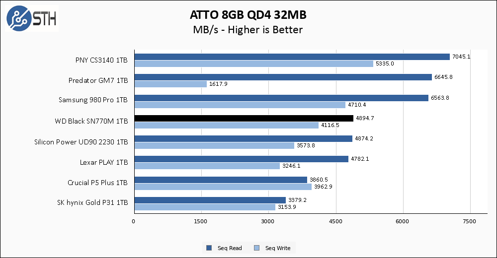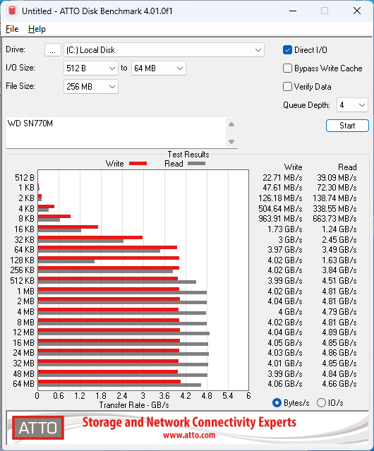 ATTO sequential results tend to come in slightly below what CrystalDiskMark records on most of my reviews, and that is the case here for the WD SN770M. Results for both sequential read and write look good here, with the continuing exception that write results are below advertised spec. My only problem with the performance on display here is the mismatch between what is advertised and what is delivered.