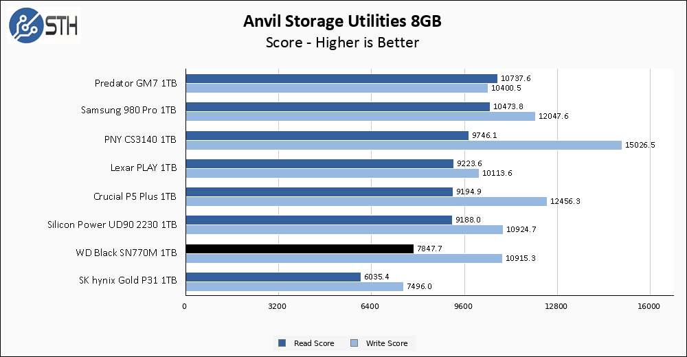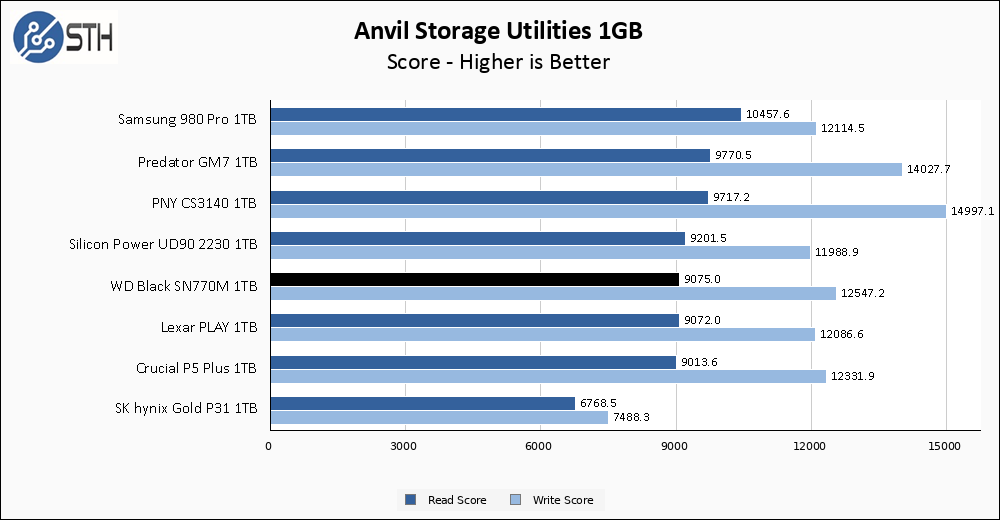 Anvil results for the WD SN770M 1TB are good, with read score results right in line with the UD90 and the PLAY, and slightly superior write performance compared to those two drives.