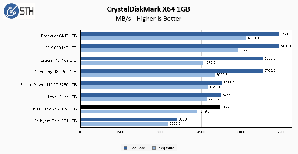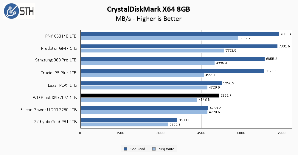The WD SN770M performance on the larger CrystalDiskMark test remains essentially identical. That is good because no performance was lost, but less so because write performance still remains below spec.