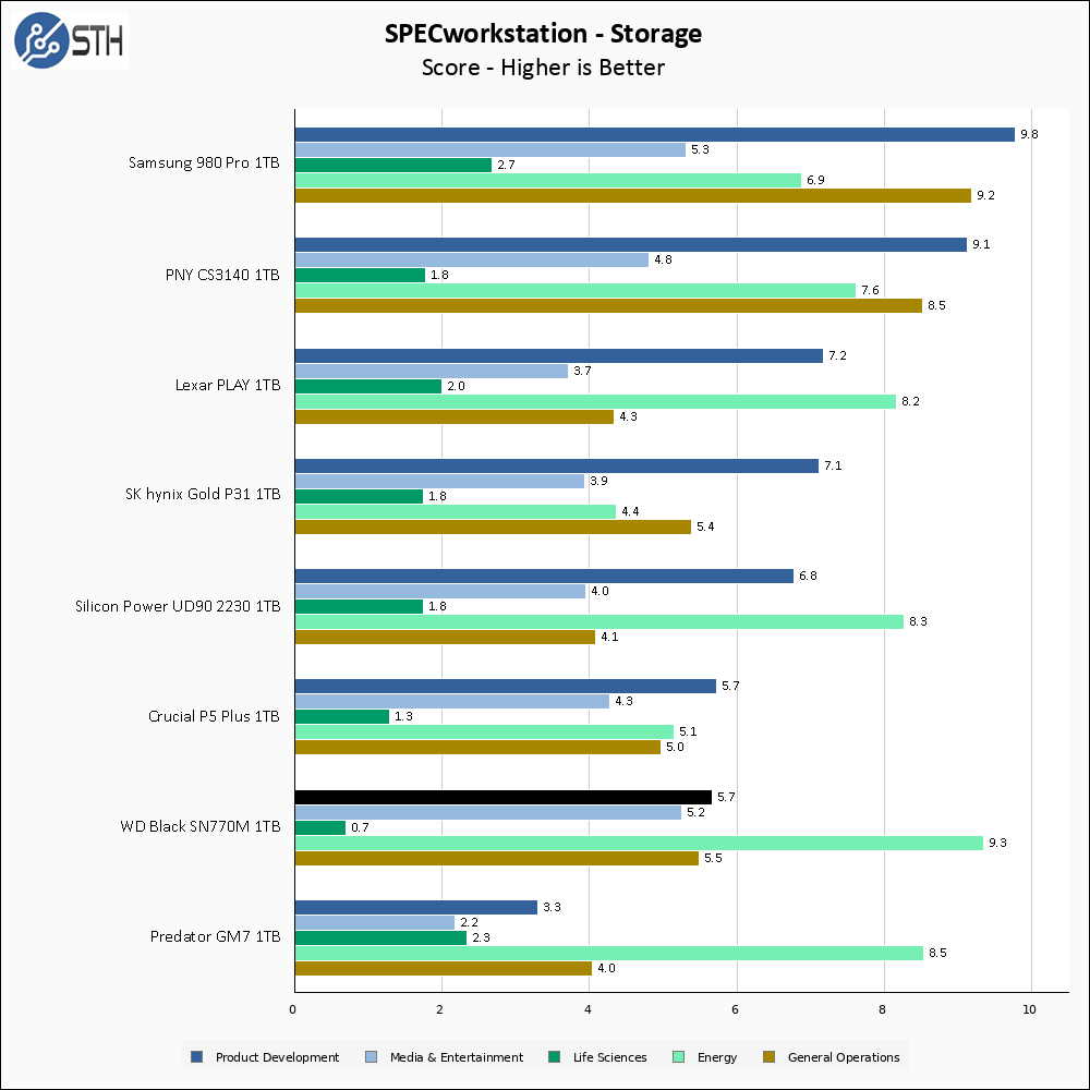 Performance in SPECworkstation for the SN770M is a bit of a mixed bag. Media and Energy results are very strong, General Operations and Product Dev are middling, and Life Sciences is terrible. SPEC performance likely is not what this drive is targeted at, so I am mostly fine with these results.