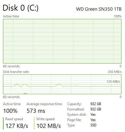 The Post-cache write speed on the WD Green SN350 is poor at 105 MB/s. Given the endurance rating on the drive, perhaps writing slowly is a feature so that you do not burn out your drive too fast! Realistically though, this is a read focused drive.