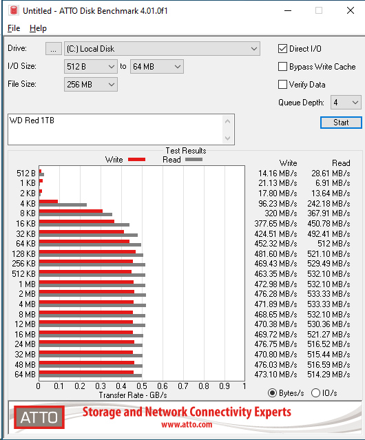 Relative to the advertised specs, ATTO shows a slight dip in performance. Additionally, compared to the SAT5200-960G the WD Red SA500 1TB has a bit less consistent performance overall, wavering up and down slightly through the duration of the ATTO test.