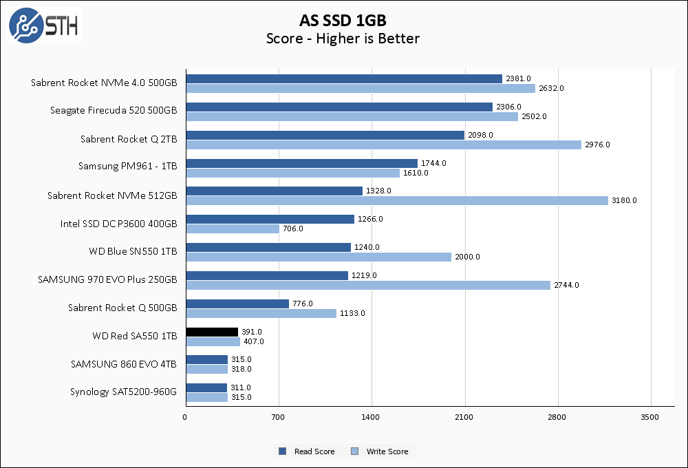The SA500 1TB manages to register a solid win in ASSSD compared to the other SATA drives in our test set. Strong 4K-64Thread numbers help separate it from the Synology and Samsung drives.