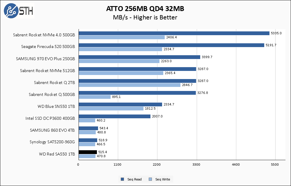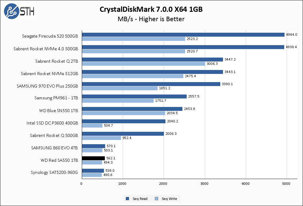 In Anvil the WD Red SA500 1TB manages to distance itself slightly from the Synology drive, and notches better performance overall than the Samsung 860 EVO as well. All three SATA drives exhibit better read performance than the Rocket Q 500GB.
