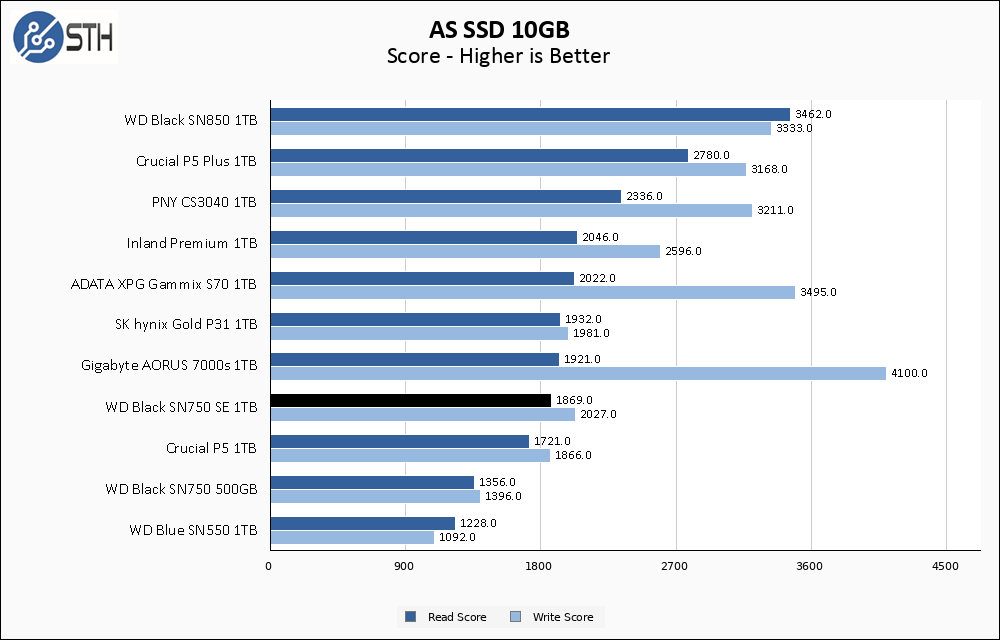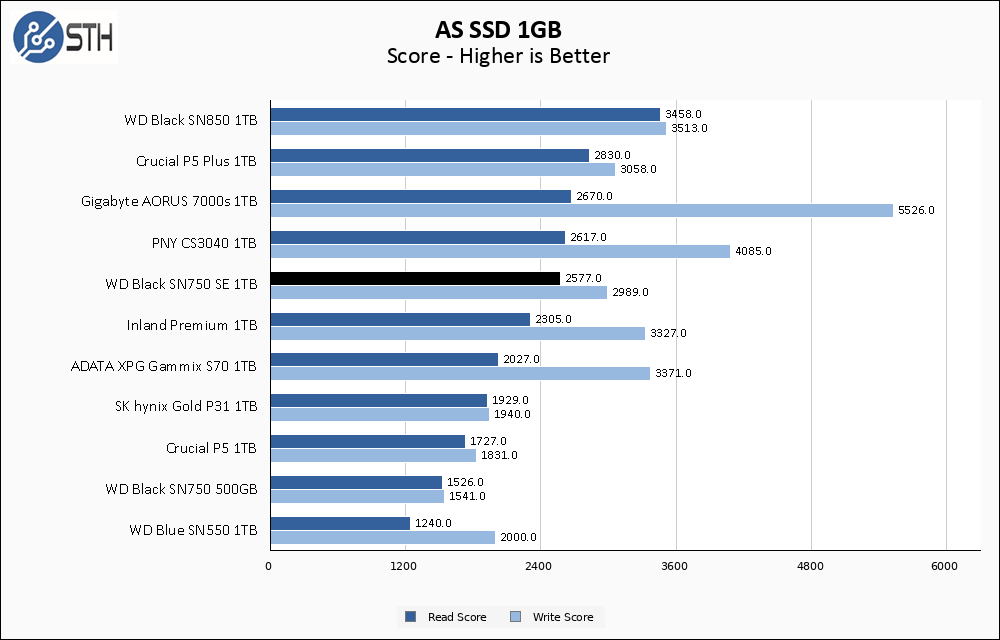 The larger AS SSD test is a different story; the WD Black SN750 SE can only fend off the lower end PCIe 3.0 drives. Everything high end or PCIe 4.0 leaves it in the dust.