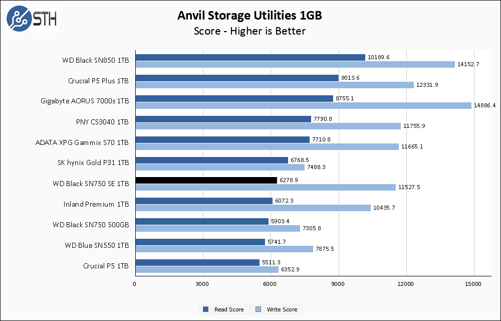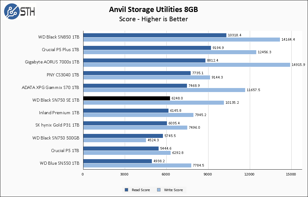 Anvil shows the WD Black SN750 SE sitting nearly at the top of the PCIe 3.0 pack, which would be great if it was a 3.0 drive. Write score gets a typical Phison-in-Anvil bump and is competitive with other 4.0 drives in overall score.