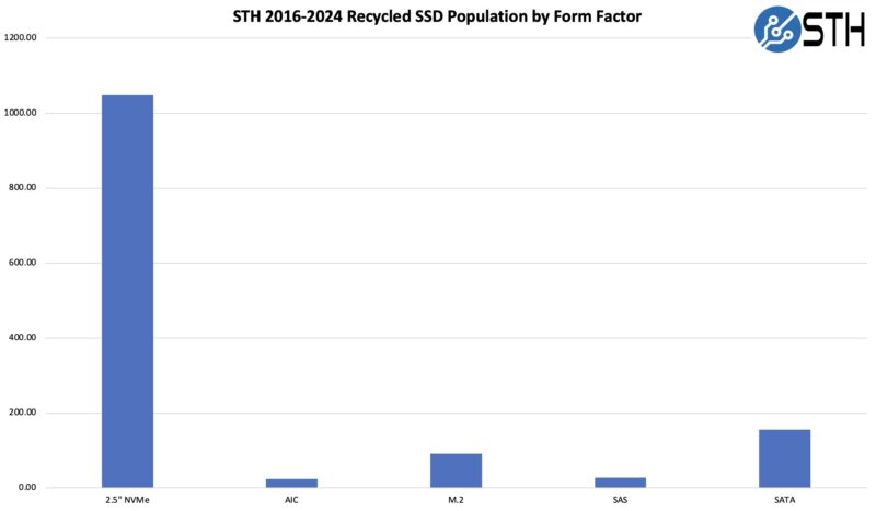 The vast majority of our drives come in 2.5″ form factors. We had a handful of PCIe add-in cards for specific projects. There were also a few SAS drives for some servers that used legacy SAS storage arrays. The M.2 drives were a bit lower at just under $100 here. One of the big reasons is that we often purchase boot M.2 devices new since drives like the SK Hynix P31 tend to be low power and good boot devices for us. On the SATA side, back in 2016-2018, it was more common for us to get systems that had SAS/SATA bays, and often we filled those bays with SATA rather than SAS drives.